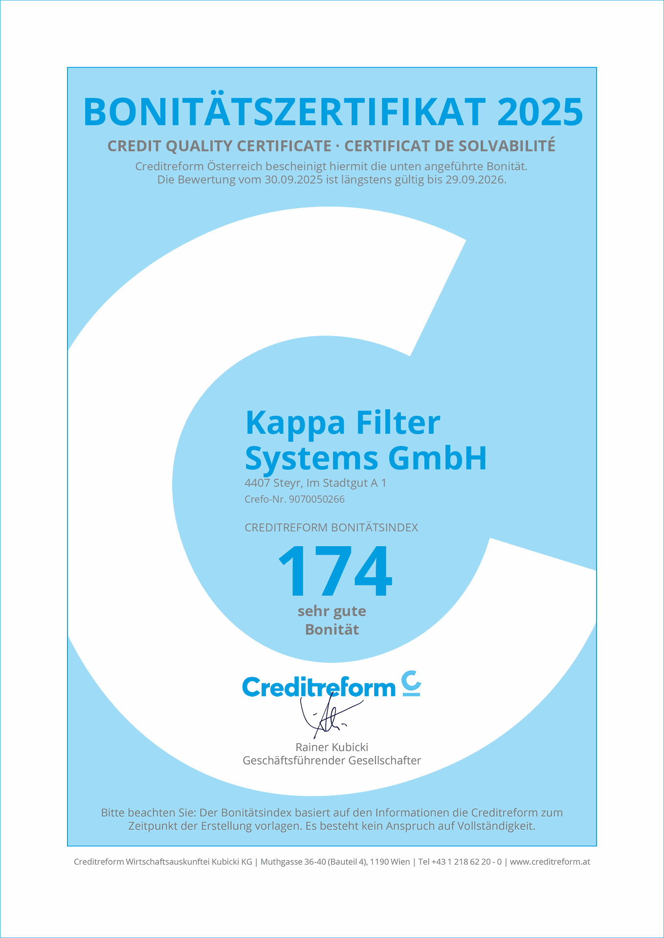 Kappa Filter Systems GmbH übernimmt keine Haftung für Datenverlust oder andere technische Beeinträchtigungen, die beim Betrachten oder Herunterladen von Daten dieser Webseite entstehen können. Bei Links zu anderen Webseiten übernimmt die Kappa Filter Systems GmbH keine Haftung für deren Inhalt.